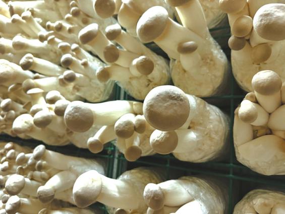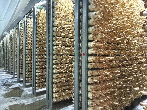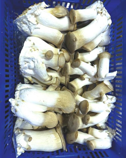 在养殖杏鲍菇的车间里,有数个3米多高的菌架,上面密密麻麻整齐地摆满菌包,每个菌包上还“冒”出数个大小不一的杏鲍菇。