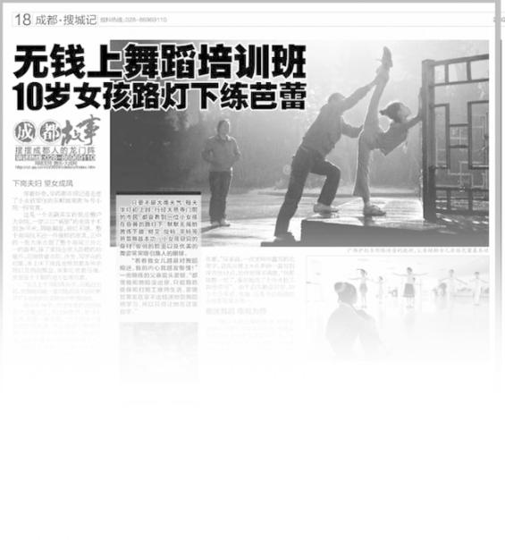 2010年10月,华西都市报记者朱建国拍摄采访的这篇《无钱上培训班,10岁女孩路灯下练芭蕾》的报道感动了无数读者。
