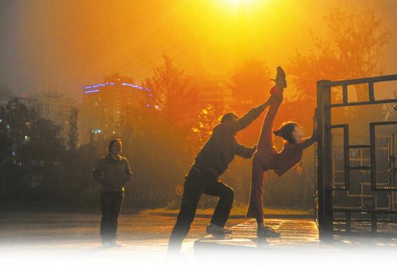 2010年10月9日,成都大慈寺门前,10岁女孩姚启凤在路灯下练芭蕾。朱建国摄