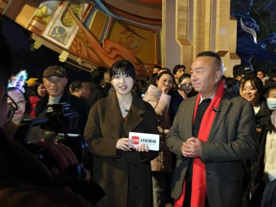 张方来(前排右一)在自贡灯会上参与封面新闻的直播。