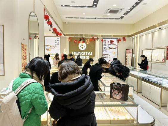 记者看到,店内有多位顾客正在挑选金饰品。两位老人想要买“蛇宝宝”项链。“孙儿刚出生,想给他买一串‘蛇宝宝’项链,也是个祝福。”孙婆婆笑着说。最终两人选购了一款纳福“蛇宝宝”手链。