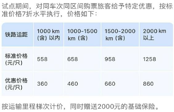 试点高铁宠物托运服务按运输里程梯次计价,初期实行七折优惠,同时赠送保额2000元的基础保险。具体定价为:运距1000km(含)优惠价360元/只,1000-1500km(含)优惠价460元/只,1500-2000km(含)优惠价660元/只,2000km以上860元/只。铁路部门提示,广大旅客朋友如需获取高铁宠物托运服务更多信息,可拨打12306和95572客服热线,或在铁路12306客户端查询。试点期间,铁路部门将广泛听取旅客朋友的意见建议,持续改进高铁宠物托运服务,为旅客出行提供更多便利。