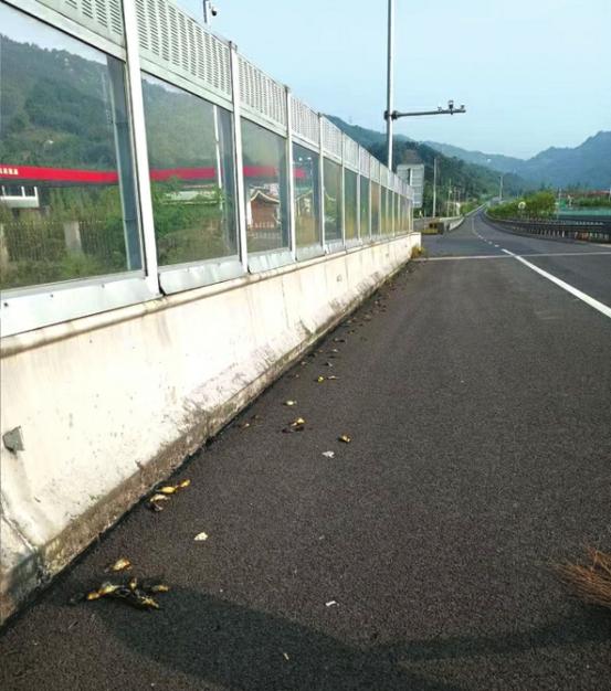 视频显示,在仁沐新高速沐川境内一段透明屏障的地面上,躺着很多死亡的鸟儿。视频配文称,死亡鸟儿为国家二级保护动物红嘴相思鸟,疑似在穿过高速路飞行过程中不小心撞死,数量有上百只。