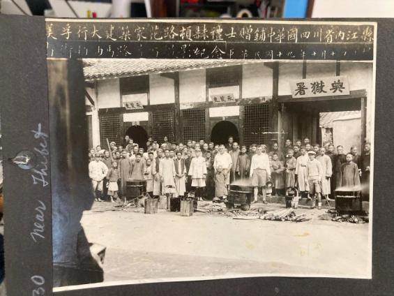记者注意到,这张老照片里,有几十个不同年龄段的人站在一栋名为“典狱署”的建筑前合影,中间有两名外国人。照片上方有两行字,第一行字写着:“美孚行大建筑家花路顿赫礼士赠铺……四川省内江县”,第二行字迹稍显模糊,隐约写着“南街柏油马路道面摄影纪念”。