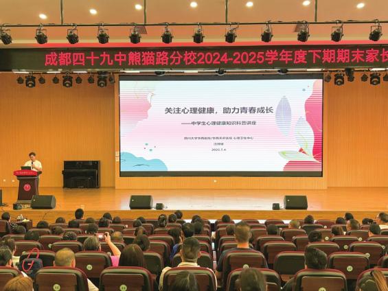 7月4日,由成华区白莲池社区卫生服务中心组织的“健康成华直通车”活动驶入成都四十九中熊猫路校区。活动特邀四川大学华西医院心理卫生中心专家汪辉耀,面向学生家长,开展“关注心理健康,助力青春成长”专题讲座。“手机依赖怎么办?”“孩子不愿沟通怎么破?”“学业压力大如何疏导?”这些萦绕在家长心头的困惑,在专业指导下找到了应对之策。