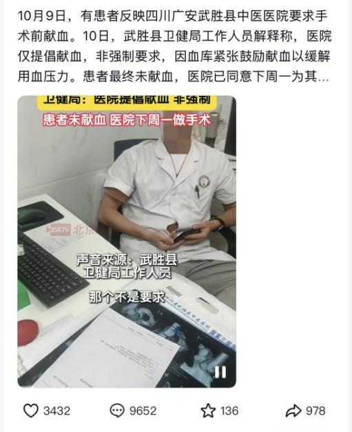 近日,一则“四川武胜某医院要求患者家属献血,不献血不给手术”的视频在网络上引发关注。视频显示,患者家属对“为何必须献血才能手术”提出疑问,医生回应称若不献血则需等待手术安排。