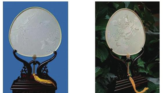 龚扇传统造型为桃形,直径约25厘米,扇面质薄如绢、柔似绫绸、滑润如镜。扇柄原多用象牙,后统一改用牛骨,配以丝质流苏,整体显得玲珑雅致。正面对光观赏,扇面呈乳白色,花鸟人物隐约浮现;向左倾斜,花纹泛出青晕,树叶转为白色;向右看去,花纹显白,树叶则透出青意。如此精工细作的一把龚扇,可保存百年而不失其韵。