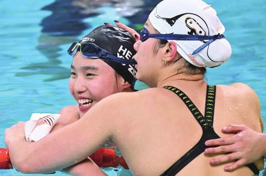 于子迪(左)在比赛后与浙江队选手余依婷拥抱致意。 新华社发