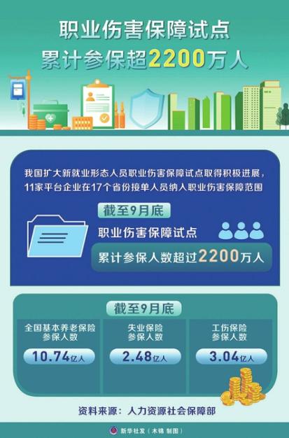 我国于2022年7月启动新就业形态人员职业伤害保障(以下简称“新职伤”)试点。今年5月,人力资源和社会保障部等九部门联合印发通知扩大“新职伤”试点(以下简称《通知》),明确7月1日起,在已先行试点7个省份和7个平台企业的基础上,增加天津、河北、辽宁、宁夏等10个省份,增加滴滴出行、顺丰同城等4家规模较大的平台企业开展职业伤害保障试点。数据显示,截至9月底,职业伤害保障试点累计参保人数超2200万人。