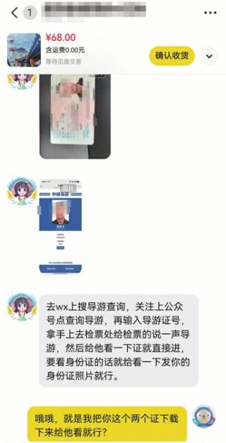 在咸鱼平台,记者向两个卖家询价后,分别支付了68元、78元,并按照对方要求提供了正面照片和年龄信息。他们明确表示,会使用他人的导游证进入景区,“要看下你的样貌,找一个匹配的导游证。”