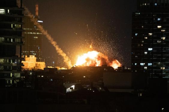 ▲2月28日晚,以色列特拉维夫市区传出巨大爆炸声,有建筑物冒出火光。 新华社发
