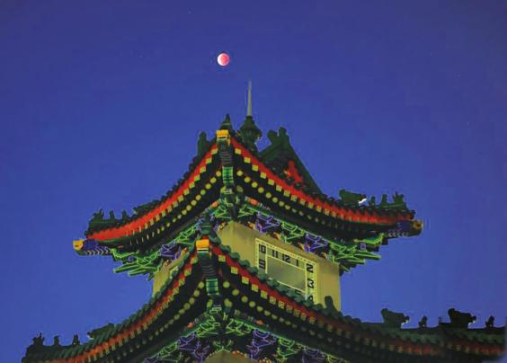 比较有趣的是,全食阶段的月亮看起来呈暗红色,施韡解释,这是由于大气散射,将一部分太阳光折射到了月球表面,“当光线穿过地球大气层时,波长较短的蓝紫光容易被大气散射掉,而波长较长的红光则更容易穿透大气,被折射到月球表面。”于是,本应暗淡的月球被染上了一层古铜色,有时甚至会是更鲜艳的血色,所以人们常称其为“红月亮”或“血月”。