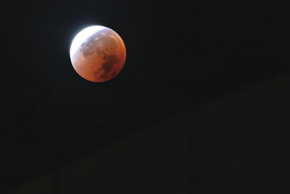 当日、地、月三者精确地排成一条直线,地球遮挡住了太阳直射向月球的光线,将月球罩进了自己庞大的“身影”中,月全食就发生了。