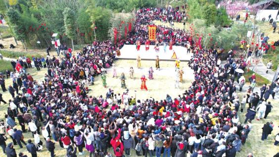 马年春节,英歌舞表演走进蒲江明月村。
