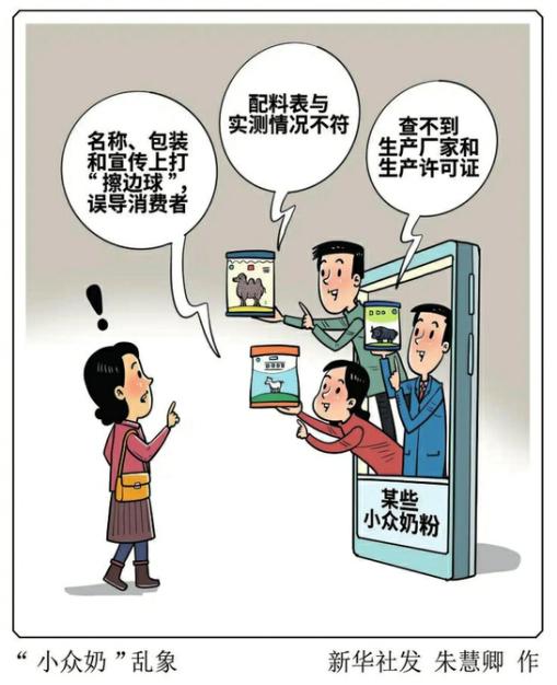 记者调查发现,随着小众奶粉逐渐受到大众欢迎,市场上出现了一些“挂羊头卖狗肉”的情况。有的产品在名称、包装和宣传上打“擦边球”,误导消费者;有的产品配料表与实测情况不符;还有的产品甚至查不到生产厂家和生产许可证……