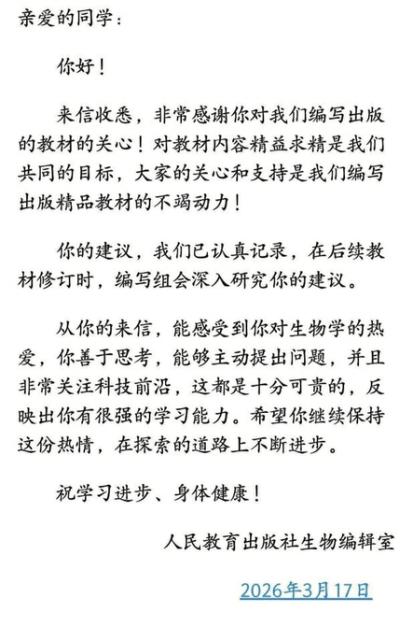 3月17日,人教社回信小冯,信中说:“非常感谢你对我们编写出版的教材的关心!对教材内容精益求精是我们共同的目标,大家的关心和支持是我们编写出版精品教材的不竭动力!你的建议,我们已认真记录,在后续教材修订时,编写组会深入研究你的建议。从你的来信,能感受到你对生物学的热爱,你善于思考,能够主动提出问题,并且非常关注科技前沿,这都是十分可贵的,反映出你有很强的学习能力。希望你继续保持这份热情,在探索的道路上不断进步。”