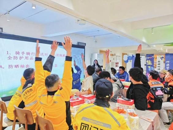 句句朴素而真挚的话语,传递着同行之间惺惺相惜的温暖。互动环节,知识小问答、蒙眼原地踏步、看图猜谐音梗三个趣味项目轮番登场,题目紧密结合骑手日常工作和社区志愿服务,既有趣味性,又兼具参与感。现场笑声不断,气氛热烈。