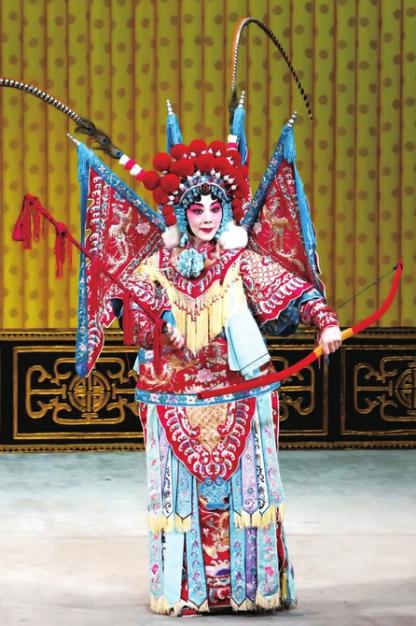 京剧《穆桂英挂帅》中的穆桂英(王怡饰)形象也常戴雉尾翎头冠。据北京日报