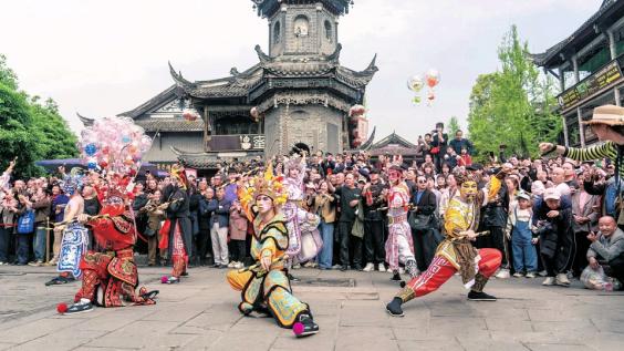 传统景区玩出了新意。青城山-都江堰景区清明首日接待人数和收入双双翻番。国家级非遗“都江堰放水节”不仅隆重呈现古法祭祀放水大典,还配套了集章打卡、万灯祈福、研学课堂和烟火市集,让民俗“活”了起来,还专门针对中小学生春假提供免费活动。