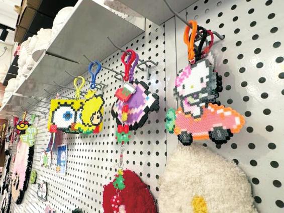 在上海市一家手工坊内的展示墙上,挂着各式各样的拼豆挂件。图据新华社客户端